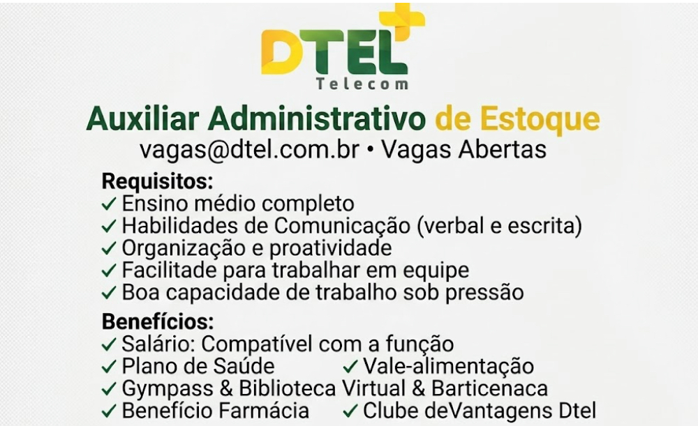Você busca uma oportunidade para ingressar em uma das empresas que mais cresce no setor de tecnologia e conectividade? A DTEL Telecom está expandindo seu time e busca um Auxiliar Administrativo de Estoque detalhista, organizado e com foco em resultados para atuar em nossa central logística.