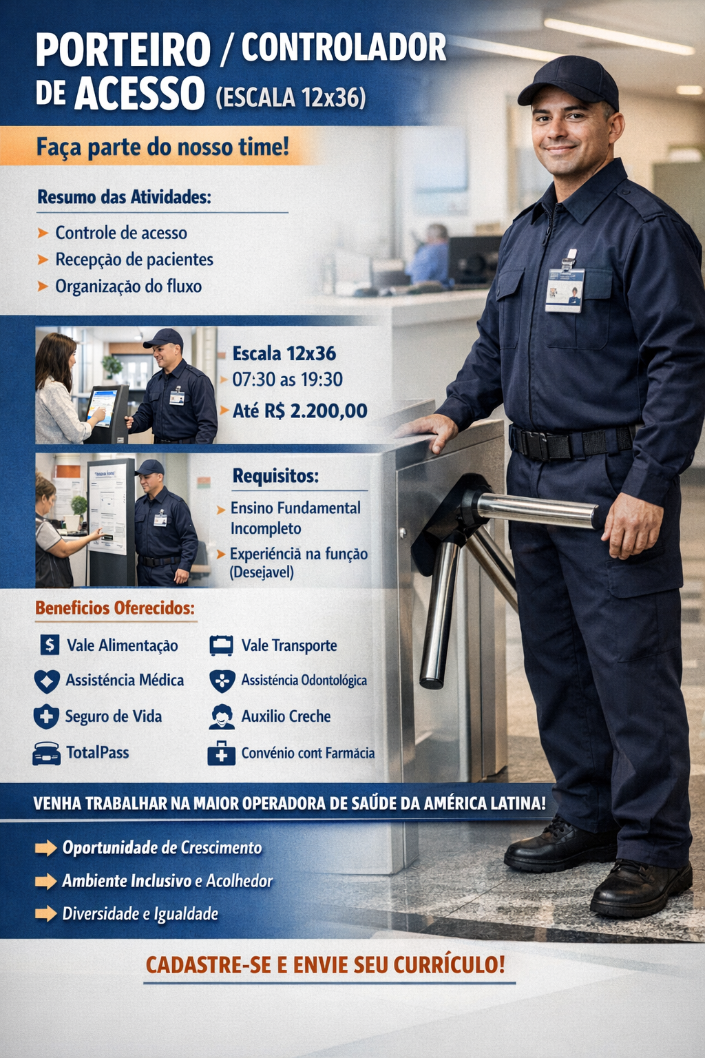 Atuar no controle de acesso da unidade, garantindo a organização do fluxo de pessoas, segurança do ambiente e um atendimento cordial aos pacientes e visitantes.