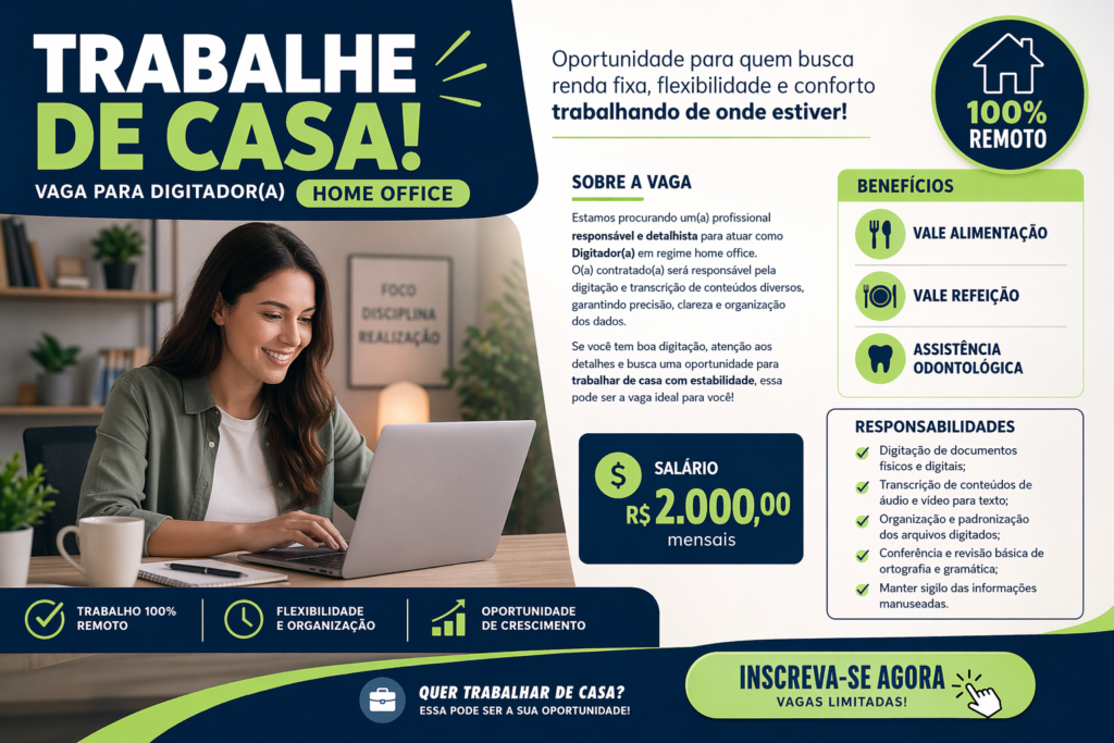 Se você está em busca de uma oportunidade para trabalhar de casa, com salário fixo, benefícios e uma rotina organizada, essa vaga de Digitador(a) pode ser uma excelente escolha para iniciar ou continuar sua carreira no formato remoto, com mais conforto, praticidade e qualidade de vida.